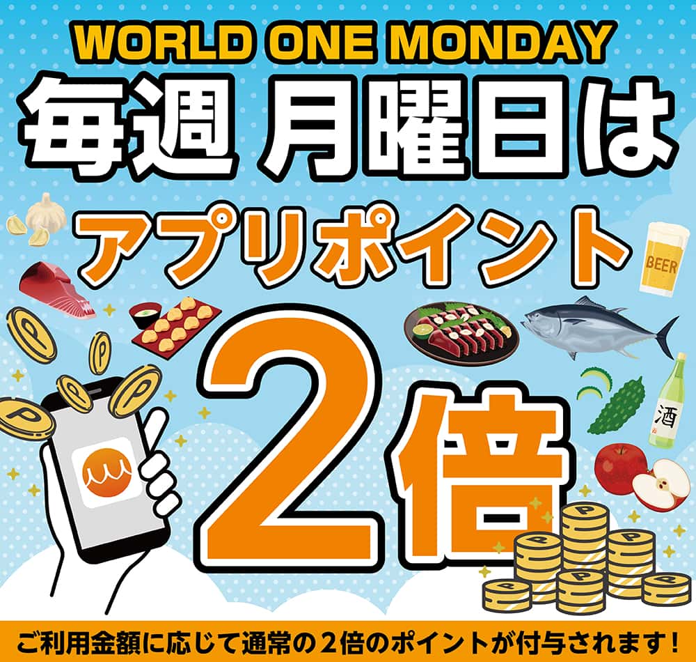 【アプリ】毎週月曜日はお会計ポイント2倍★~ワールド・ワンマンデー~