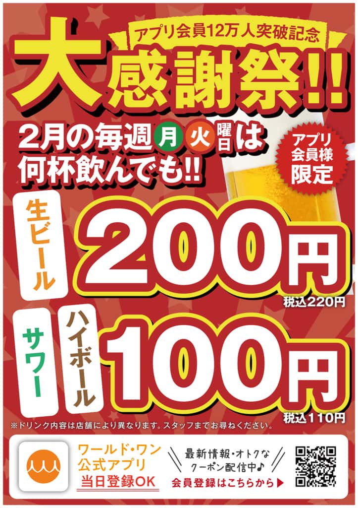 【アプリ会員12万人突破記念】2月の毎週月・火曜日は 何杯飲んでもドリンクがお得!