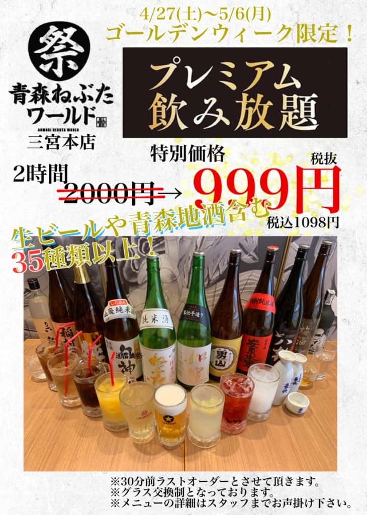 店舗名:青森ねぶたワールド 三宮本店 期間:4月27日~5月6日 ※ワールド・ワン会員さま限定 通常2,000円のプレミアム飲み放題が GW期間限定でなんと!999円! ●概要 90分飲み放題 999円(税込1,098円) ・当サービスは青森ねぶたワールド三宮本店限定です。 ・予約不要。当日受付可能です。 ・グループ皆様でのご利用をお願いしております。 ・ワールド・ワン会員さま限定。 ・他券併用不可。 ●飲み放題ドリンク 【ビール】サッポロラガー(瓶)/サッポロ黒ラベル(生) 【ハイボール】デュワーズハイボール/コークハイボール/ ジンジャーハイボール/青森カシスハイボール 【サワー】レモンサワー/男梅サワー/カルピスサワー 【青森サワー】超りんごサワー/りんご酢サワー/青森カシスサワー 【梅酒・果実酒】十和田ブルーベリー梅酒/八鶴 んめー梅酒 【青森焼酎】六趣(長芋)/どでん(にんにく) 【焼酎】和ら麦(麦)/からり芋(芋) 【ワイン】グラスワイン赤・白 【青森焼酎】六趣(長芋)/どでん(にんにく) 【青森地酒】ねぶた淡麗純米/陸奥男山クラシック/八鶴剛酒濃醇超辛純米/ 北勇純純米/安東水軍特別純/白神山廃純米/如空銀ラベル純米/稲村屋特別純米 【日本酒】松竹梅 豪快 【ソフトドリンク】桜庭りんご農園さんの無添加100%りんごジュース/ ウーロン茶/コーラ/ジンジャーエール/カルピスジュース/オレンジジュース