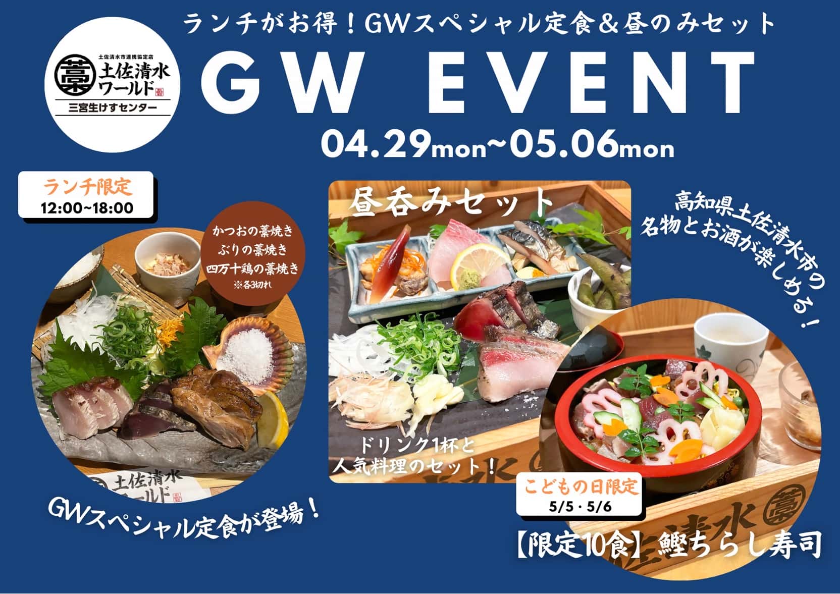 店舗名:土佐清水ワールド 三宮生けすセンター 期間:4月29日~5月6日 ★4/29~5/6【12時〜18時】GWスペシャル定食が登場! かつおと宿毛ブリと四万十鶏(各3切ずつ)の藁焼きが乗った大満足定食!! ・価格 1,780円(税込) ★5/5〜5/6【限定10食】こどもの日★鰹ちらし寿司定食 藁焼きしたかつおを漬け込んだ豪華ちらし寿司! 1日10食限定の販売で、2日間のみの販売のためお早めのご来店がおすすめ! ・価格 1,280円(税込) ★ 4/29~5/6【12時〜16時】選べるドリンク1杯+土佐のおつまみ おひとり様も大歓迎♪少しづついろんな種類のお料理が楽しめる〈昼呑みセット〉が登場! ・価格 1,980円(税込) 〈土佐おつまみ内容〉 かつおの藁焼き2切れ/宿毛ぶりの藁焼き2きれ/お酒のあて3種/枝豆 〈対象ドリンク〉 生ビール/レモンサワー/ダバダ火振りハイ/ハイボール/土佐鶴(日本酒グラス)