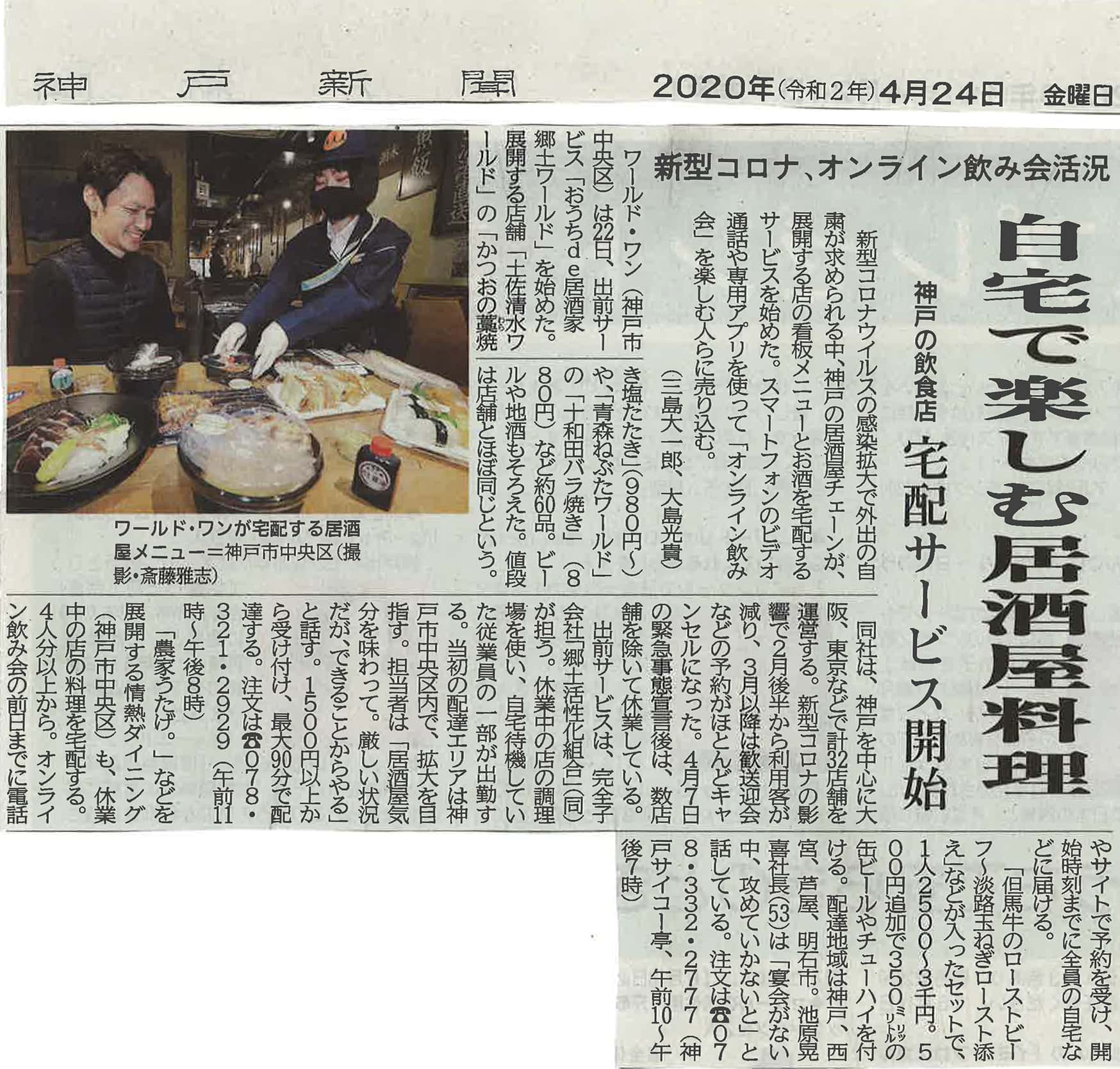TOP > メディア掲載情報 > 【神戸新聞 4月24日掲載】デリバリー事業について掲載いただきました。 2020/05/04 【神戸新聞 4月24日掲載】デリバリー事業について掲載いただきました。 神戸新聞にデリバリー事業について掲載いただきました。 関連記事 2019/03/20 【テレビ朝日「ワイド!スクランブル」 3月20日放送】土佐清水ワールド三宮生けすセンターについて取り上げていただきました。 2023/10/11 【Kiss PRESS】「à la ringo(あら、りんご。)西神中央店」オープンについて掲載いただきました 2020/09/01 【ESSE 10月号 掲載】à la ringo「焼きドーナツ」について掲載いただきました。 お問い合わせはこちら