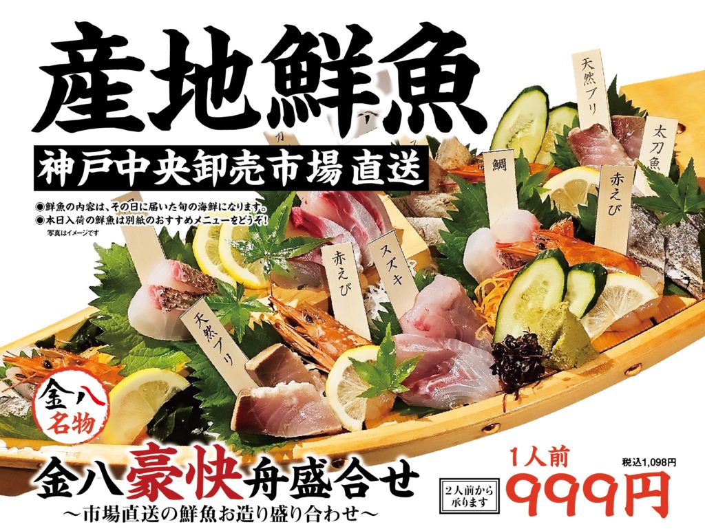 ぜひ、神戸市中央卸売市場から届いた"おいしい鮮魚"が堪能できるお店としてパワーアップした「地魚大衆酒場 金八」にお越しください!