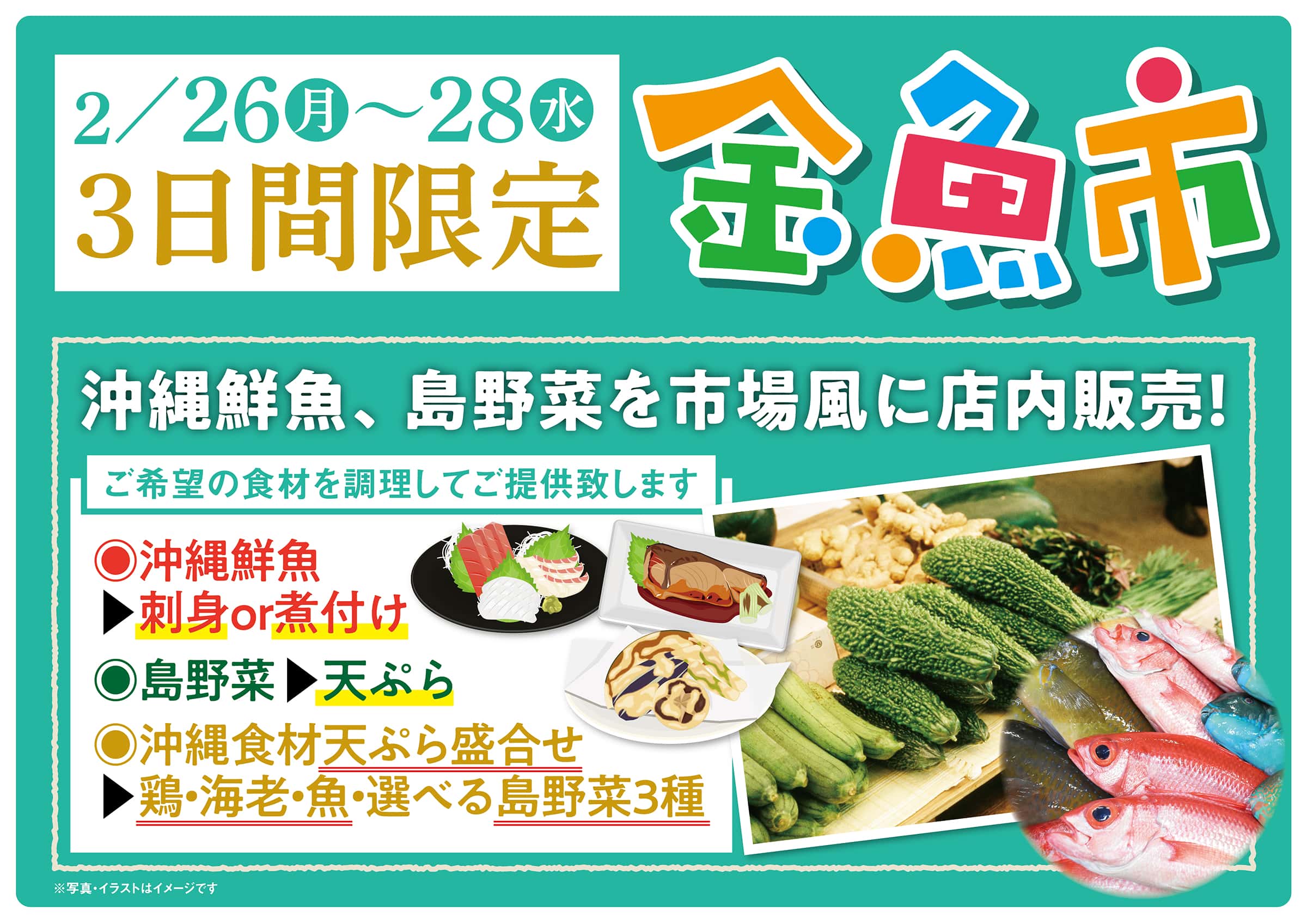 3日間限定で金魚に市場が登場!新鮮な沖縄鮮魚や島野菜をお客様ご自身でピックアップ!その場で刺身や天ぷらに調理してお召し上がりいただけます★