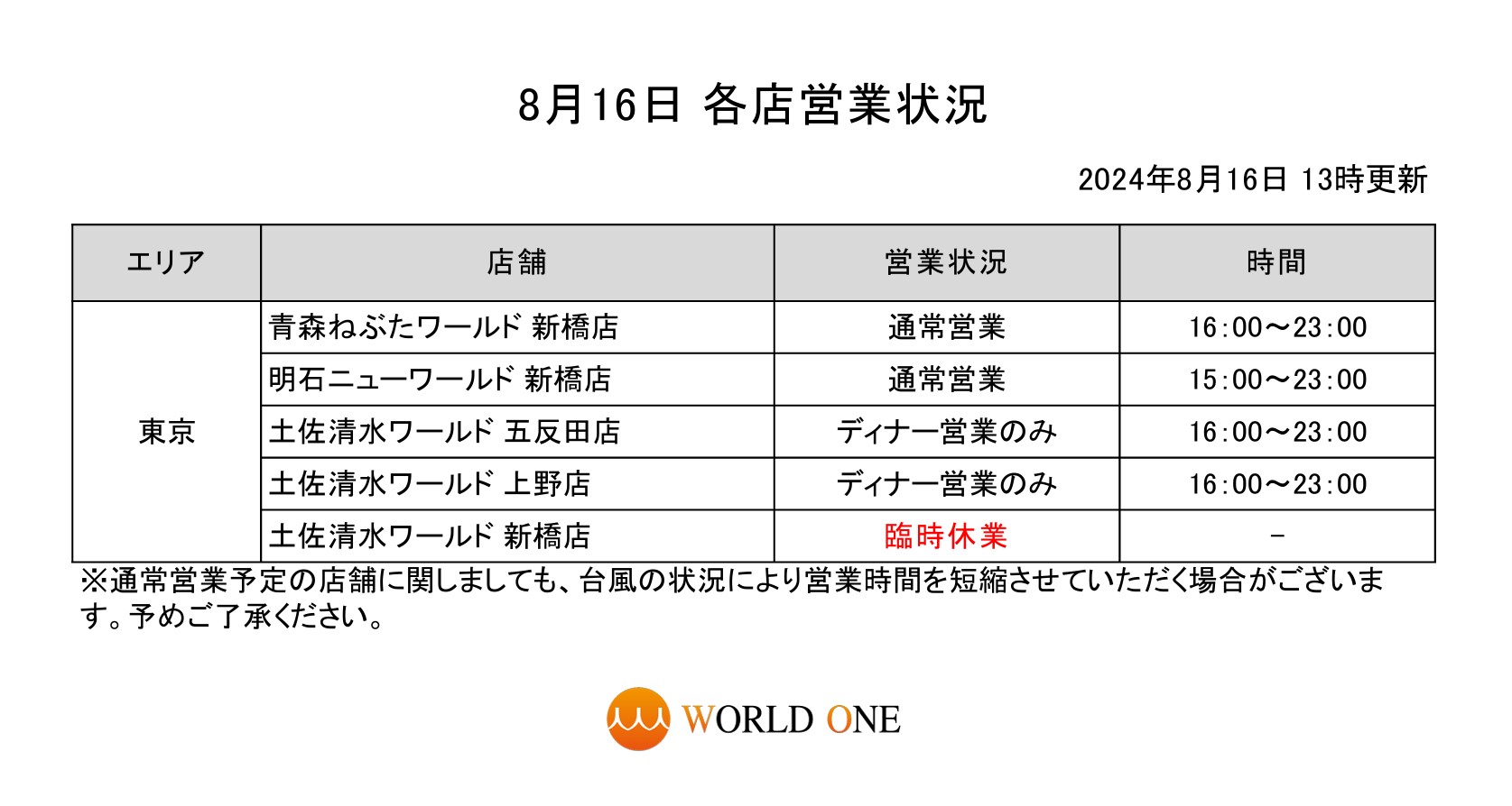 8月16日は東京エリア店舗では休業および営業時間を変更させていただきます。