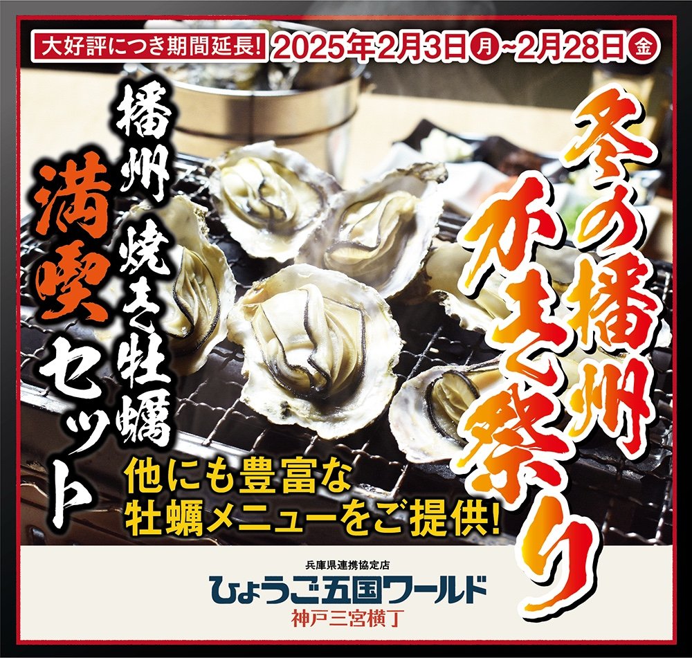12月1日(日)より、ひょうご五国ワールド神戸三宮横丁にて播州の牡蠣を使ったフェア「冬の播州 かき祭り」を期間限定で開催!!
