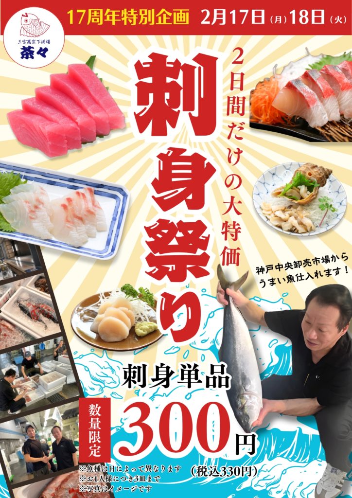 おかげさまで「三宮高架下酒場 茶々」17周年★刺身単品が330円!!