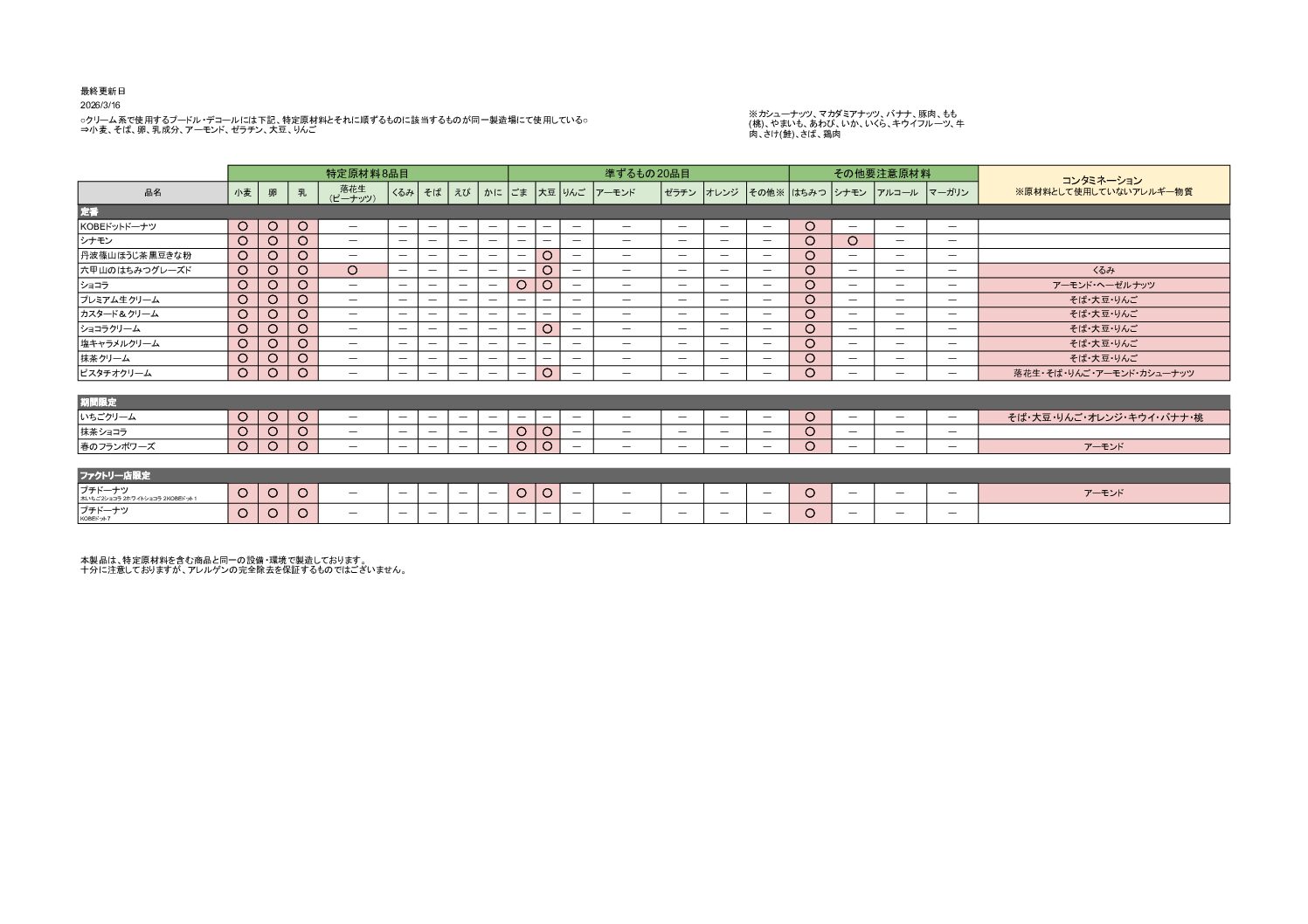 ドットドーナツアレルギー食材使用一覧 - 3月16日スタート分