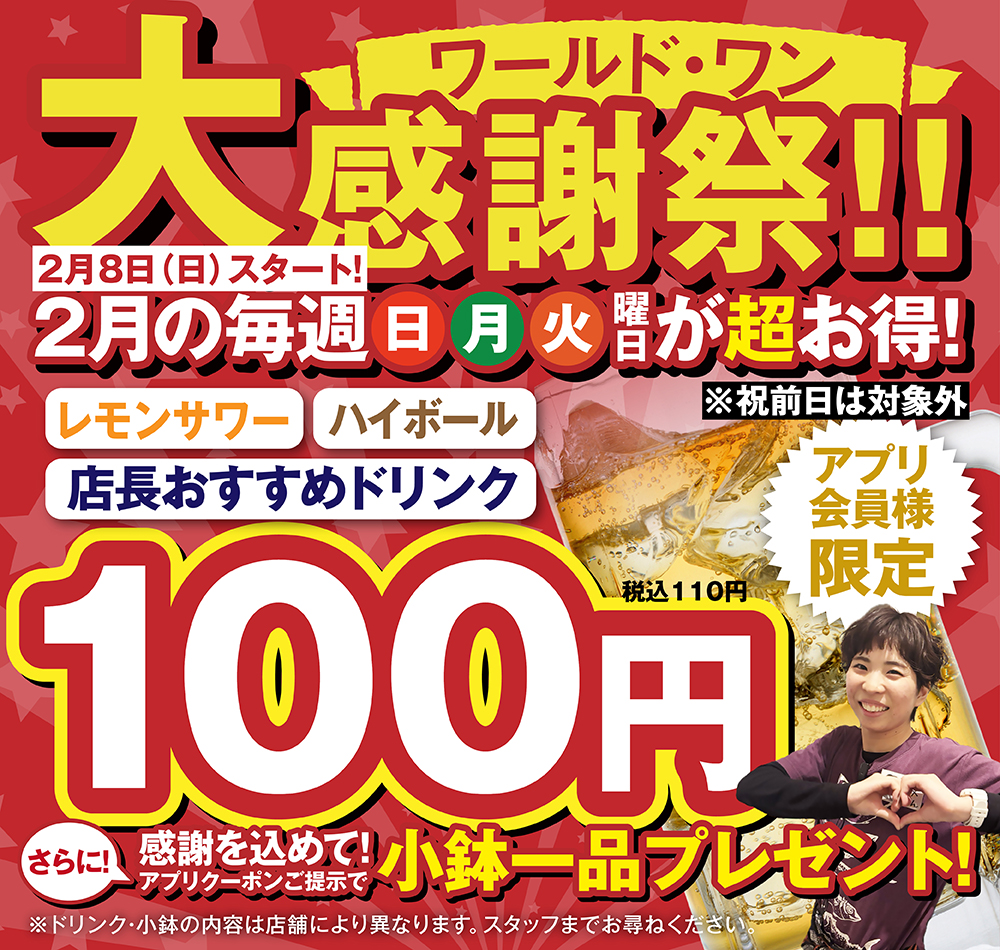【ワールド・ワン大感謝祭】2月8日から!毎週日・月・火は何杯飲んでもドリンクがお得&小鉢プレゼント!