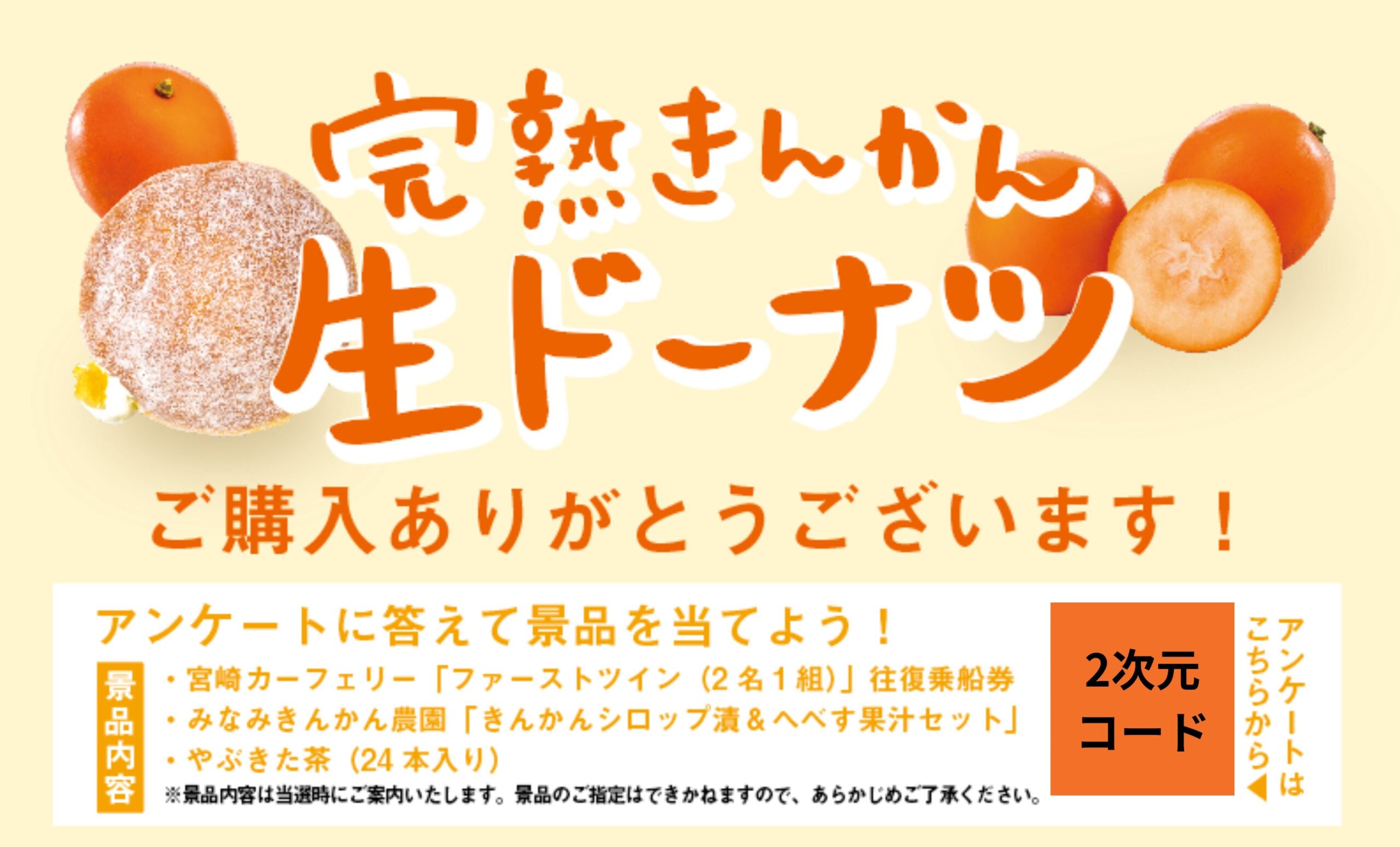 「 完熟きんかん生ドーナツ」を購入いただいたお客様限定で、アンケートキャンペーンを開催!ご購入時にお渡しするチケットの二次元コードよりアンケートにご回答いただいた方の中から、抽選で豪華賞品をプレゼント♪賞品のひとつとして、宮崎カーフェリーの「ファーストツイン(2名1組)」往復乗船券をご用意。快適な船内でゆったり過ごしながら、神戸から宮崎へ向かう船旅は、移動時間そのものが思い出になる特別な体験です。