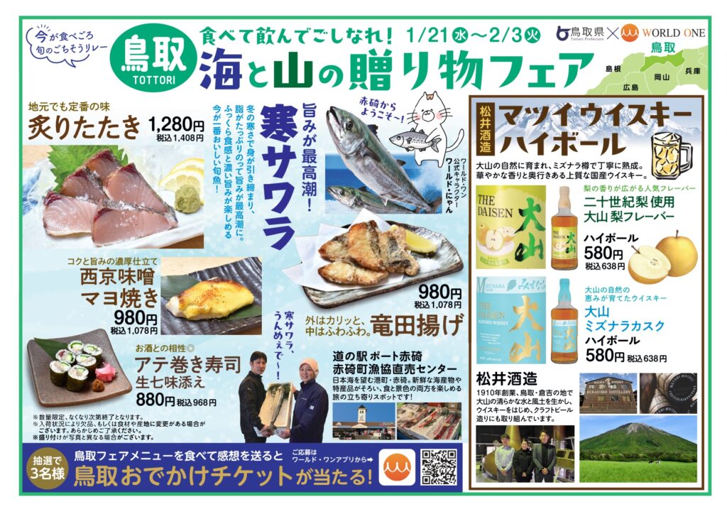 神戸を中心に郷土連携型の飲食店を展開する株式会社ワールド・ワン(本社:兵庫県神戸市、代表取締役:古里宣光)は、鳥取県と連携し「食べて飲んでごしなれ!鳥取 海と山の贈り物フェア」を開催します。2026年1月21日(水)から2月3日(火)までの期間、神戸・大阪・東京の系列16店舗で実施します。