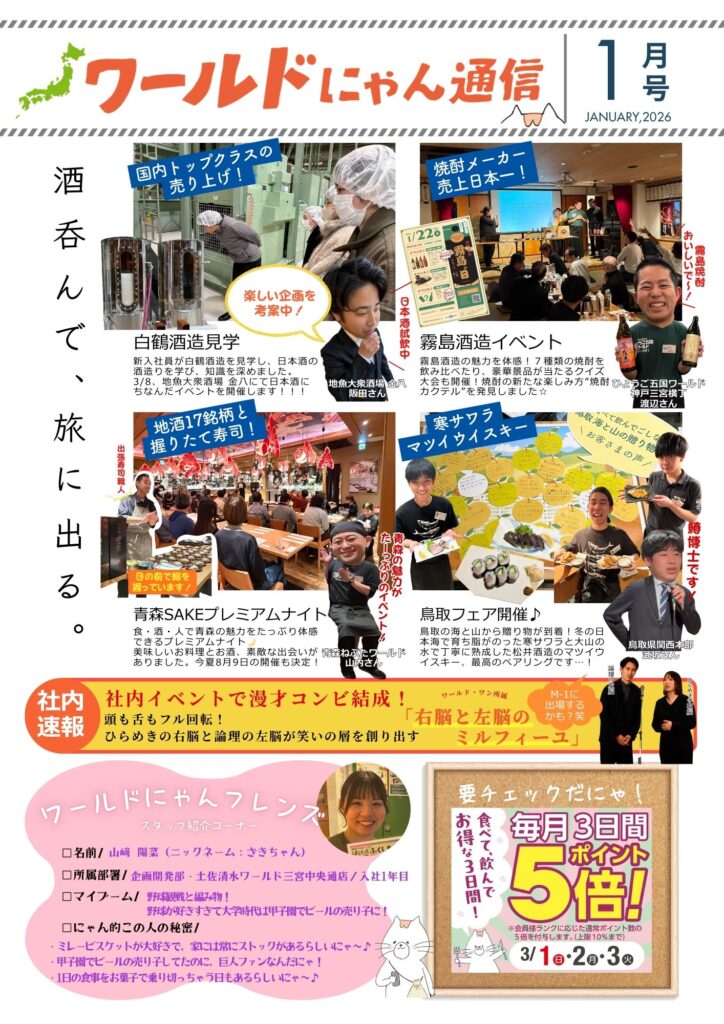 TOP > ニュース > お知らせ一覧 > お知らせ詳細 2026/02/13 酒呑んで、旅に出る。 ▶︎2026年1月号 ワールド・にゃん通信とは ワールド・ワン公式キャラクター「ワールド・にゃん」が、日本各地を旅しながら出会った食・人・まちの魅力をお届けするニュースレター「ワールドにゃん通信」。 生産地での出会いや、フェアの裏側、その土地ならではのとっておきのエピソードを、発信しています! これまでに配信した「ワールドにゃん通信」は、下記の特設ページからご覧いただけます。 👉 ワールドにゃん通信一覧はこちら 読むだけで、ちょっと旅に出た気分に。ぜひご覧ください。 関連記事 2025/06/12 京都 宇治田原のお茶畑に行ってきました! 2025/08/12 感謝感激お祭り騒ぎ!!生けすセンター9周年! 2025/07/12 鳥取県に行ってきました! お問い合わせはこちら